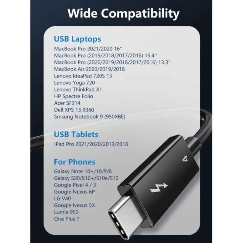 De Thunderbolt 4-kabel ondersteunt supersnel opladen tot wel 100W, wat 8 keer sneller is dan standaard USB-C kabels. Je kunt verschillende apparaten snel en efficiënt opladen.